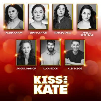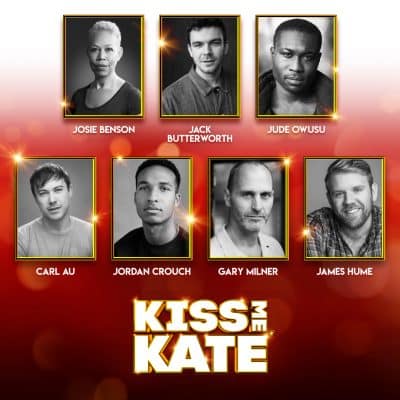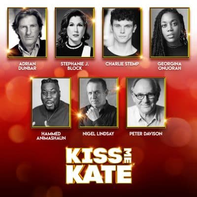 Stephanie J Block (Lilli Vanessi/Katharine), Adrian Dunbar (Fred Graham/Petruchio), Peter Davison (The General), Charlie Stemp (Bill Calhoun/Lucentio), Georgina Onuorah (Lois Lane/Bianca), Josie Benson (Hattie), Jack Butterworth (Paul), Jude Owusu (Harry Trevor/Baptista), Carl Au (Hortensio/Ensemble), Jordan Crouch (Gremio/Ensemble), Gary Milner (Ralph/Ensemble), James Hume (Pops/Ensemble), Nigel Lindsay, Hammed Animashaun, Alisha Capon, Shani Cator, Maya de Faria, Amelia Kinu Muus, Jacqui Jameson, Lucas Koch, Alex Lodge, Nell Martin, Anna McGarahan, John Stacey and Harrison Wilde. Swings are Robin Kent, Barry Drummond, Emily Goodenough and Maddie Harper (Ensemble)