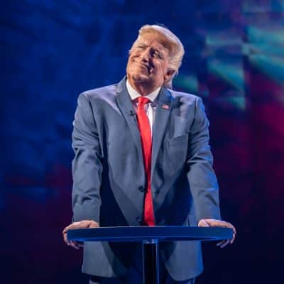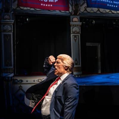 Bertie Carvel (Donald Trump), Tamara Tunie (Kamala Harris), Lydia Watson (Ivanka Trump), David Carr (ensemble), Joss Carter (Shaman), James Cooney (Charlie Takahashi), Charles Craddock (ensemble), Flora Dawson (ensemble), Eva Fontaine (ensemble), James Garnon (Ted Cruz/Bill Clinton/Paul), Richard Hansell (Steve Richetti/Ohio Senator), Miya James (ensemble), Oscar Lloyd (Donald Jnr/Matt), Jenni Maitland (Heidi Cruz/Moderator/CIA), Freddie Meredith (Eric Trump), Ben Onwukwe (Barack Obama/General Taylor), Cherelle Skeete (Tina Flournoy/Nurse Vita), David Tarkenter (George W Bush/ensemble), Ami Tredrea (Rose Takahashi), Simon Williams (Joe Biden).